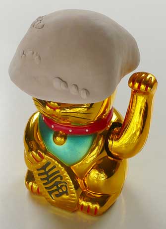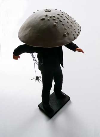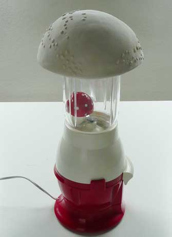 Ausgangsmaterial sind gefundene Kunststofffiguren, die je nach Kulturkreis und Tradition als Glücksbringer bewertet werden. Dieser Symbolcharakter wird formal durch einen immer wiederkehrenden Fliegenpilzhut überhöht. Der Fliegenpilz, Amanita muscaria, steht für einen rauschhaften Glückszustand, der nicht durch Besitz, sondern durch direkte Einnahme hervorgerufen wird.